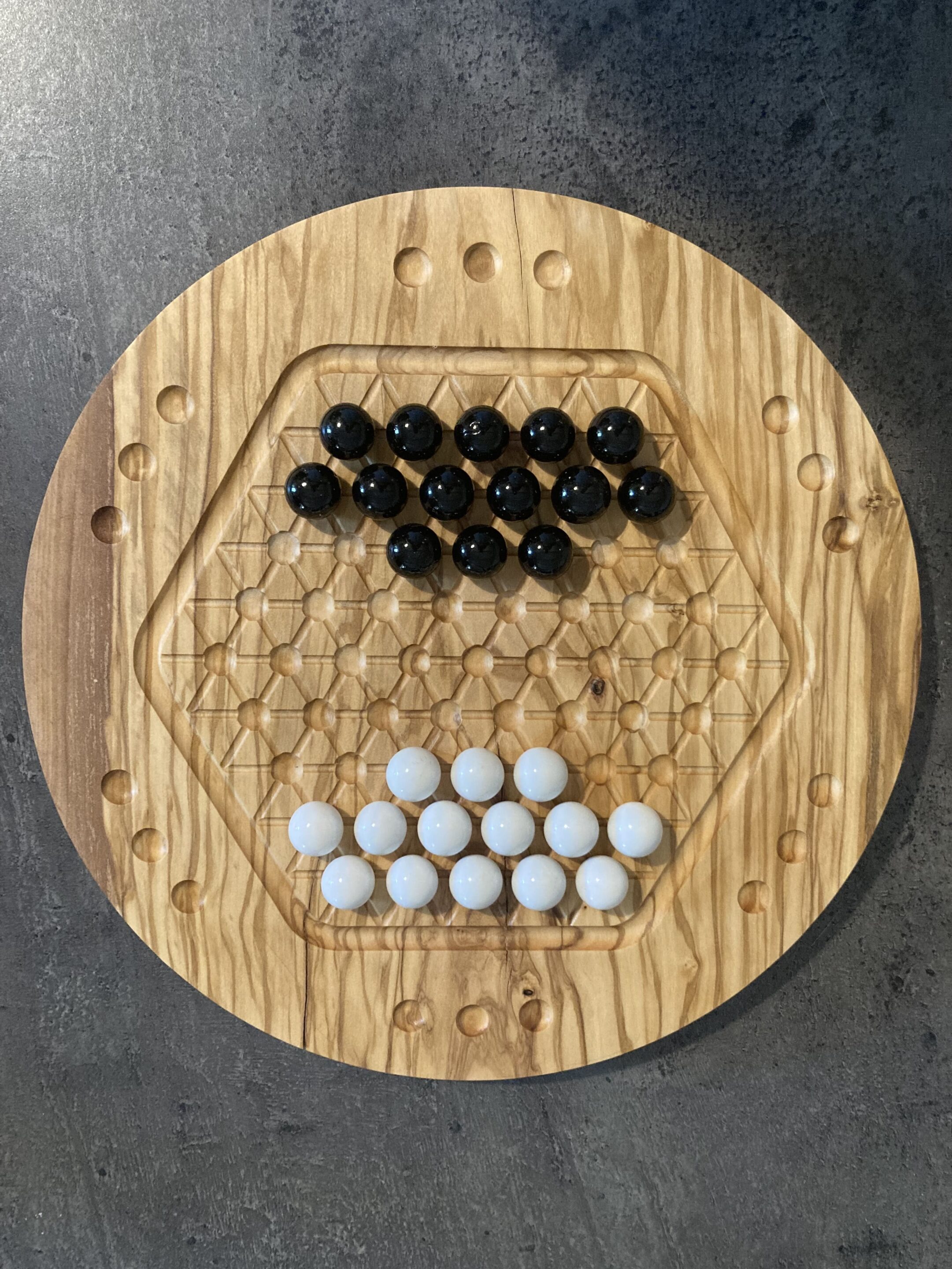 Les lignes du plateau sont gravées avec précision, créant un contraste subtil avec les nuances riches de l’olivier, tandis que les billes en verre, façonnées avec soin, glissent parfaitement. Ce jeu Abalone artisanal est non seulement un plaisir pour les passionnés de stratégie, mais aussi un véritable objet d’art, idéal pour embellir votre intérieur ou offrir en cadeau.